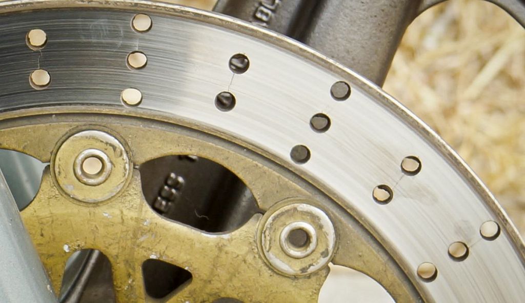 Először is: a gyári tárcsa hullámos lett, azt bontottra kellett cserélni, mert gyári új nincs, utángyártott meg csak az E-bayen. Az új tárcsán viszont apró hajszálrepedések jelentek meg a furatok körül. Izgalmas helyzet, lehet, hogy a nagy hőterhelés okozza. András is beszámolt róla, hogy bár a fék jó, szerpentinezéskor azért simán túlmelegszik. Egy új féktárcsa 25 rugó plusz posta, ennyi simán belefér, de sajnos túrni kell a netet érte.